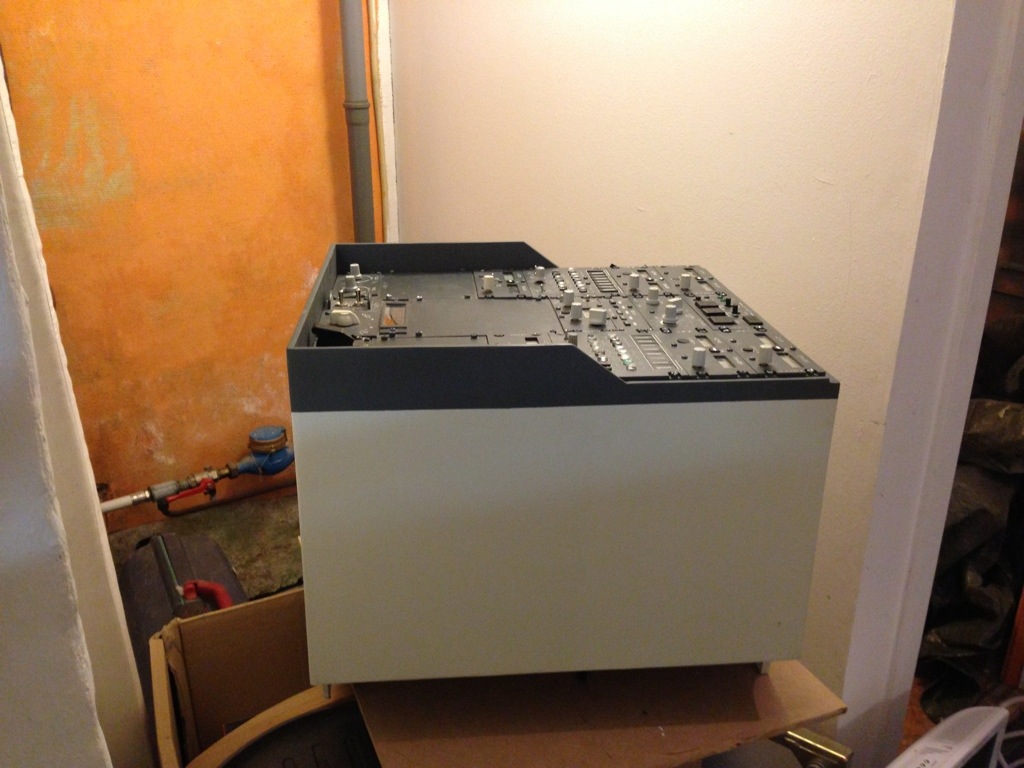 The pedestal bay is made from 6mm MDF that has been sanded and then painted with RAL 9002 (And RAL 7011 on the top part).