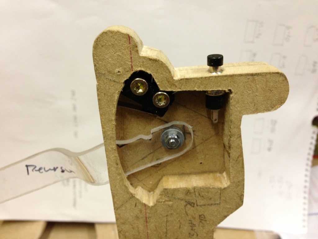 The reverser-handle is made from 3mm plexiglass, cut 2 cm wide. I thought about making them out of metal. But first of all I have no access to metal and no tools to bend it. So I chose plexiglass and have bended it using a heat gun (the kind you can remove paint with). Turned out pretty good!