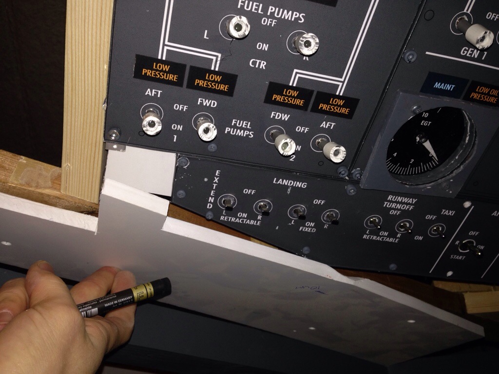 While using the small toggles I also had some of the large toggle switches in use for those guarded switches. And they looked much better and due to the longer shaft they also had a better feel. A friend (Claus from 737sim.dk) had some of the large toggles left over so he send them to me. Claus is pretty good to come up with low-tech solutions. With these large toggles he had dipped the shaft in white paint. You can see one of them on the engine starter selector.