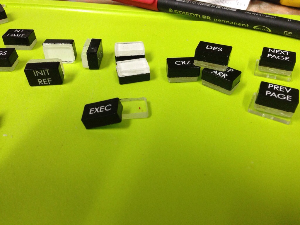 So for all 15 menu buttons I made an extra piece of plexiglas (3mm I think) and glued it on before I installed the “base” from Open Cockpits. You can see the spacer underneath the EXEC on the right. All the others shows the spacer glued on. They are the same size as the button it self. On the right (The 2 NEXT/PREV PAGE) shows the button with the spacer and the base (Not glued). The base is the wider piece that connects to the switch and ensures the button doesn’t pops out of the panel.