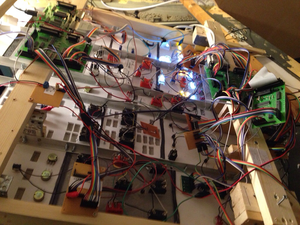The backside is one big mess at this point. I always have the best intentions. But then the wires are so short it only can run directly, and I kinda forget to get the prototyping board – that I use for each panel group – fastened.