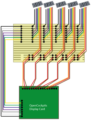 - There are 8 wires that are common by all displays connected to the same DisplayCard. However only 7 wires are used (The decimal is not supported by the OpenCockpits DisplayCard).