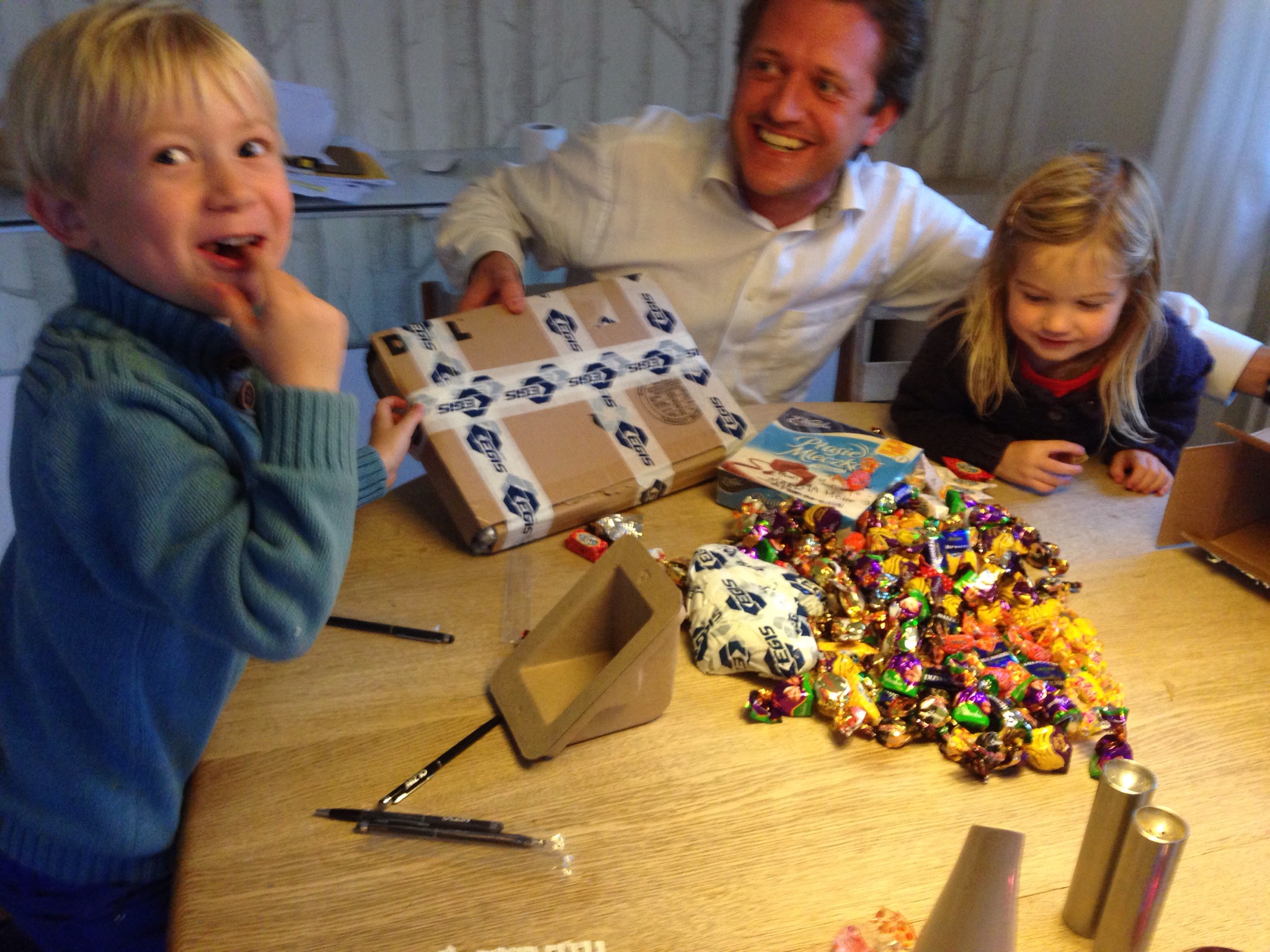 I promised to open it together with my children Frederik(5) and Ellen (3).Β And when the package arrived we saw why. To protect the screens against bumps during transport the box was filled with candy!!!