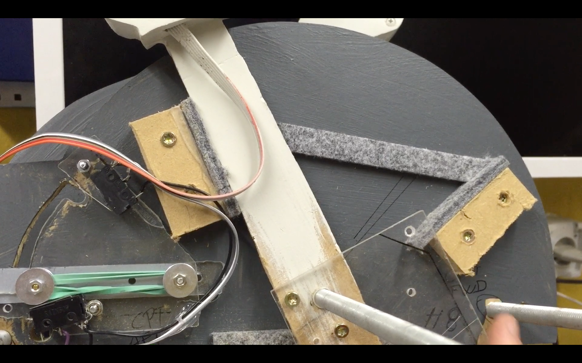 Skærmbillede 2015-10-27 kl. 10.34.50In order to apply pressure on the handle it self – to make it a bit harder to move I have used the kind of fabric that you put under your furniture to prevent it from scratching the floor. The grey fabric that I use is from IKEA. So the idea is that the handle is so tight on the axis that it presses a bit on to the fabric creating a sort of resistance when the handle is moved.