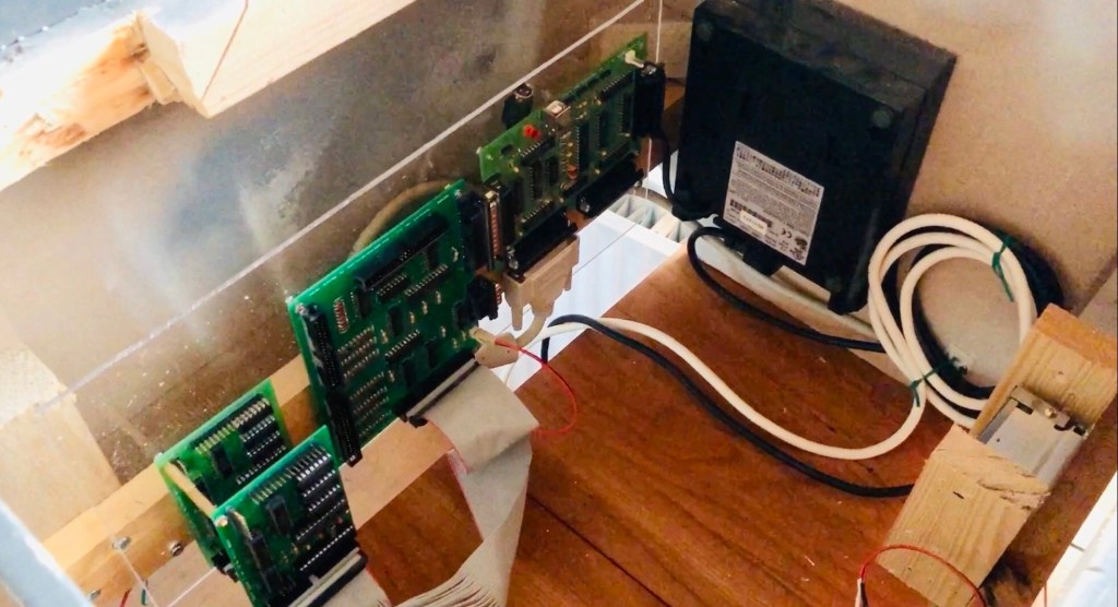 The pedestal is always a mess in wires. Each block of 7-segment displays needs at least 13 wires. 13 wires times 13 displays. That is a lot of wires going to the interface card.