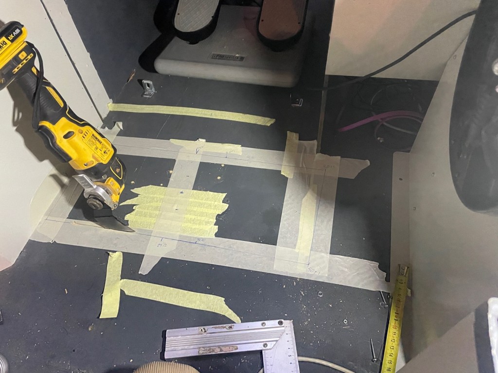 To mount it in to the cockpit it required that I made a huge hole in my cockpit-base (Which sits 25 cm above the floor). I used drawings from Marcus Pilot. Marked the coming hold with masking tape. Measured again. And slept on it. Measured again. I guess making a 20x50cm hole in the cockpit is a big deal. I made the hole and got ready to plunged the yoke in.