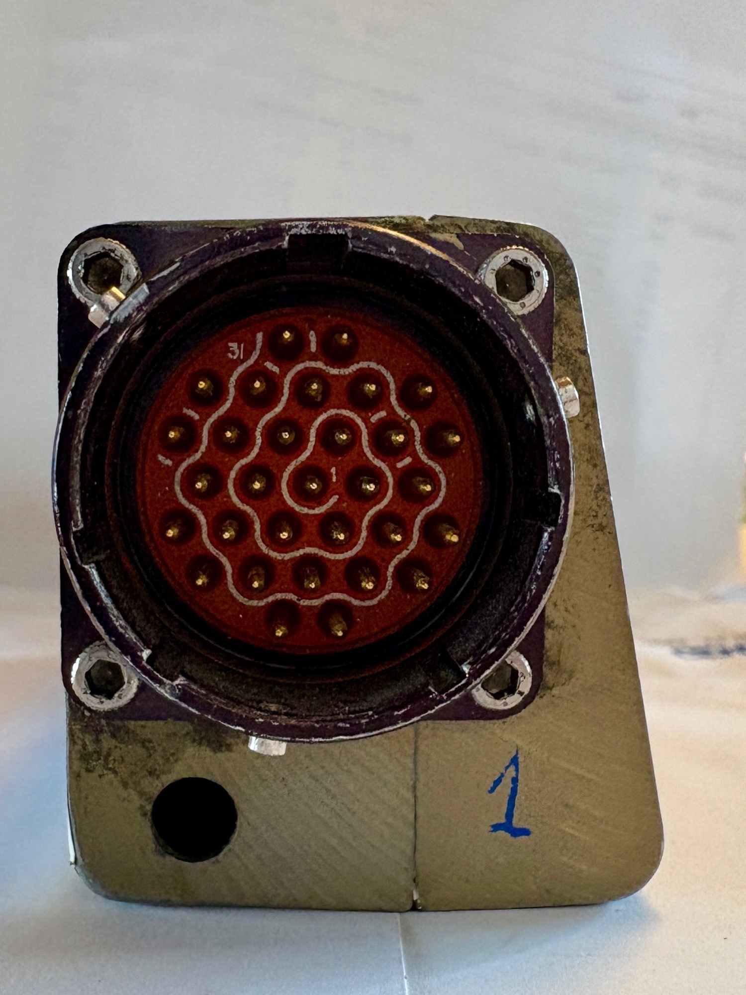 On the back of each handle there is a 31-pin cannon plug. PIN number 1 is in the middle and then it rotates clockwise outwards to pin 31. Pin 10, 20 and 30 is marked with a small white mark.