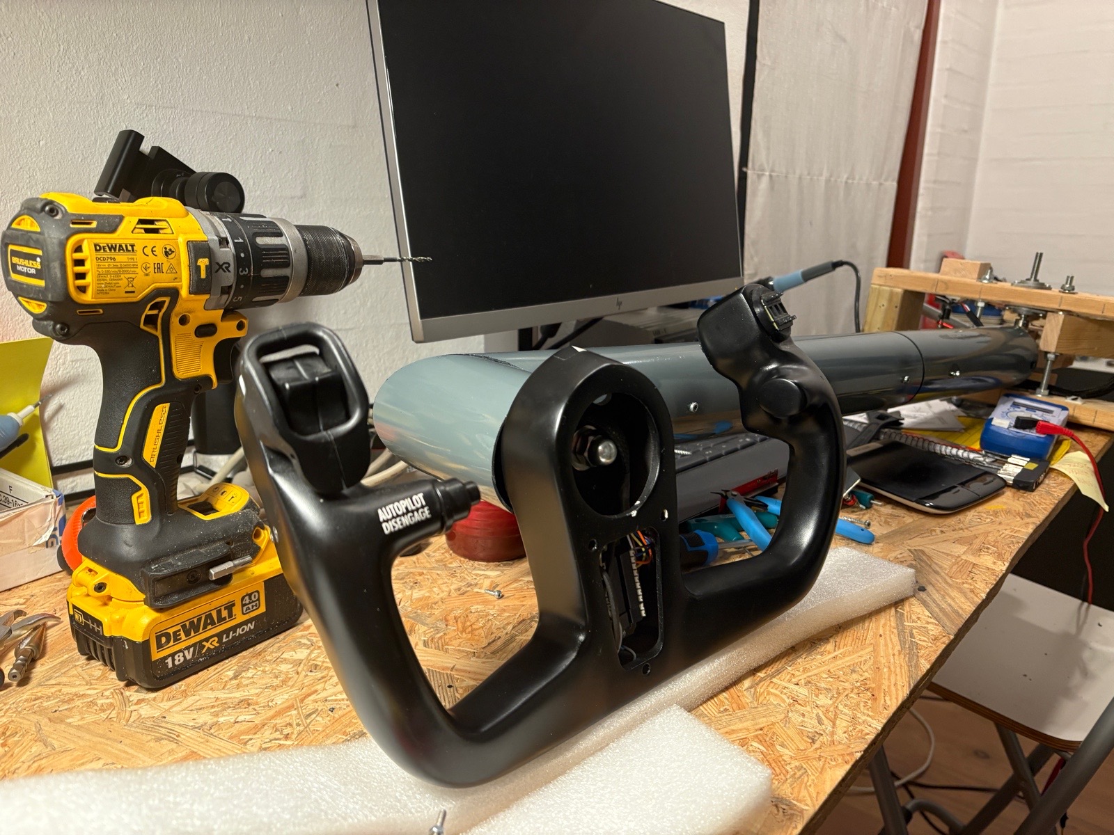 Things are actually coming together rather nice. The MIP is wired up and I took the sim for a VATSIM-flight. Got my self started in Hamburg, Germany. While holding there I tested a lot of things – among other – the rudder, elevators, ailerons. working. About half an hour later – take off. And all of a sudden the ailerons are not working. The aircraft banks to the right and continues to do so until it is up-side-down and I have to disconnect. Turn out my home make yoke is dead. So I had to pull it out from the cockpit this weekend to find out what was wrong.