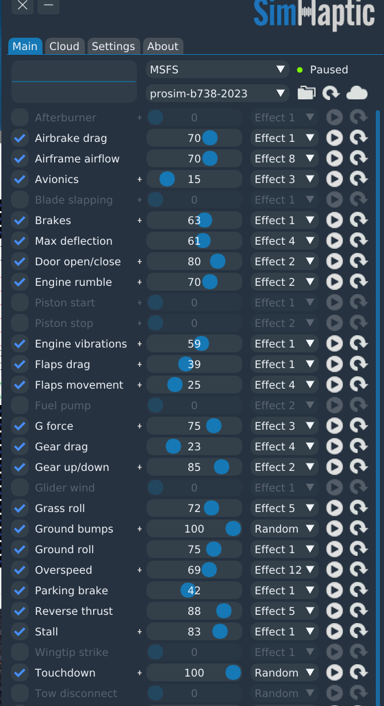 It recognized MSFS and loaded an aircraft profile. If you have other simulators (Sim or racing) I guess it also have profiles for those. The MSFS profile has different settings out of the box. For each trigger it is possible to adjust the effect and volume. So there are endless possibilities of tweaking. But out of the box I am over all satisfied with the profile. Only the Gear up/down needs to go down a bit in volume.